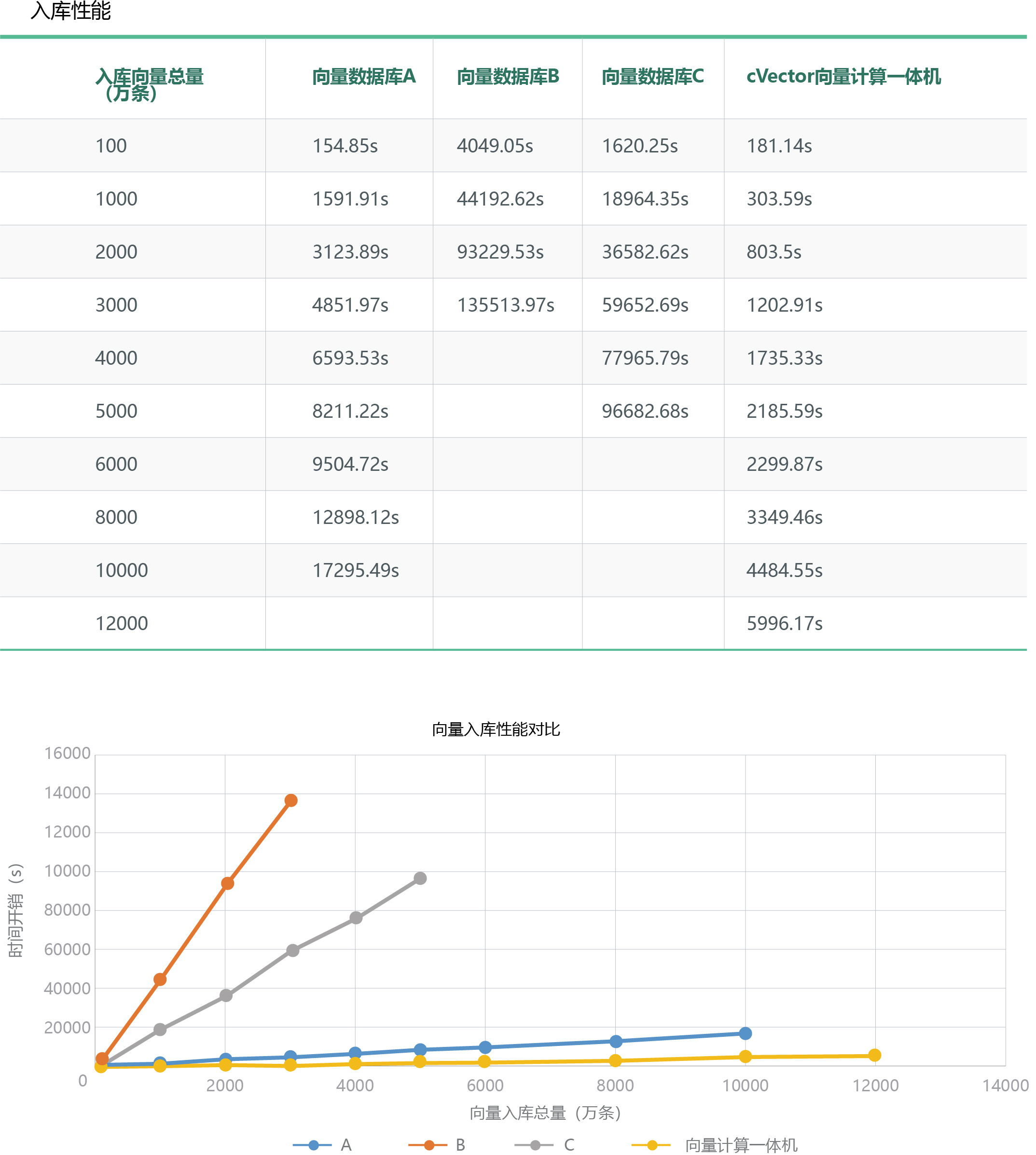在入庫性能方面,同樣入庫3000萬條256 維向量數(shù)據(jù),在向量數(shù)據(jù)庫中最快的是A,入庫速度是4851.97s,cVector向量計(jì)算一體機(jī)是1202.91s,入庫速度約是向量數(shù)據(jù)庫A的4倍,向量數(shù)據(jù)庫C的50倍,向量數(shù)據(jù)庫B的113倍;當(dāng)入庫數(shù)據(jù)達(dá)到1億條時(shí),向量數(shù)據(jù)庫A的入庫速度是17295.49s,cVector向量計(jì)算一體機(jī)是4484.55s,入庫速度約是前者的3.9倍。