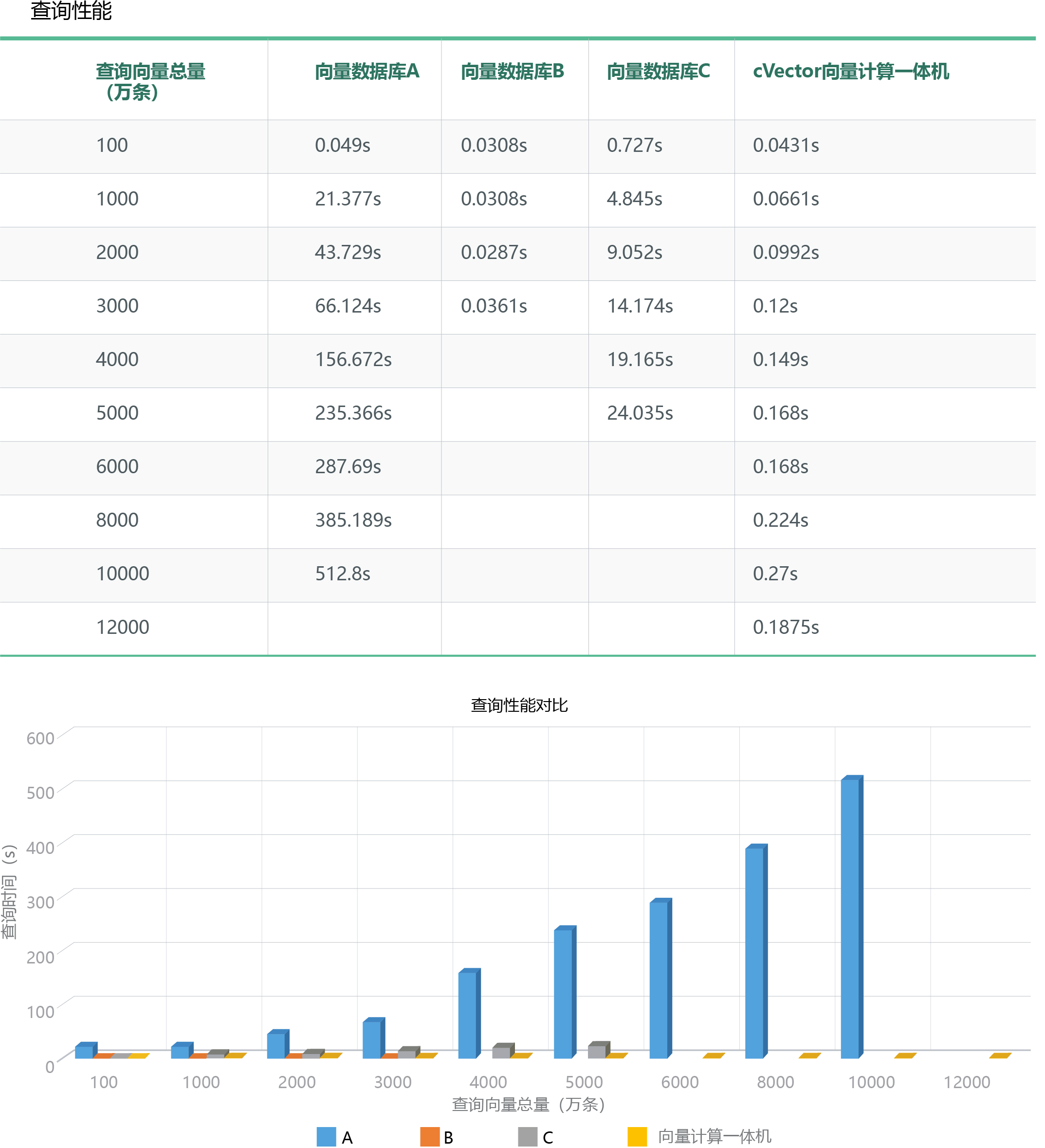 在查詢性能方面,同樣查詢1億條256 維向量數(shù)據(jù),向量數(shù)據(jù)庫A的查詢速度是512.8s,cVector向量計(jì)算一體機(jī)是0.27s,查詢速度是前者的1899倍,而其他兩家測試向量數(shù)據(jù)庫由于數(shù)據(jù)量太大無法入庫比較。