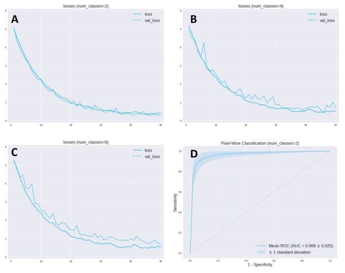 該論文旨在建立一個AI系統(tǒng),用于輔助進行前列腺癌的病理學診斷。研究人員使用機器人輔助腹腔鏡前列腺切除術中獲取的前列腺組織切片,將其轉換為數字圖像數據,并根據ISUP Gleason分級將其標記為不同的顏色。然后,將圖像輸入分割算法中。研究人員選擇修改版的U-Net作為基本的網絡架構。在172名患者中,共收集了896張前列腺組織切片,其中826張切片用于訓練集,其余的用于測試集。經過圖像分割后,AI與病理學家在22張切片中有21張達成了相同的診斷結果。在像素級別上,該AI系統(tǒng)的診斷結果的ROC曲線下面積為96.8%。三種不同的分析方法(二值分析、臨床導向分析和不同ISUP Gleason分級的分析)的像素準確度分別為96.93%、95.43%和93.88%。頻率加權的IoU值分別為94.32%、92.13%和90.21%。